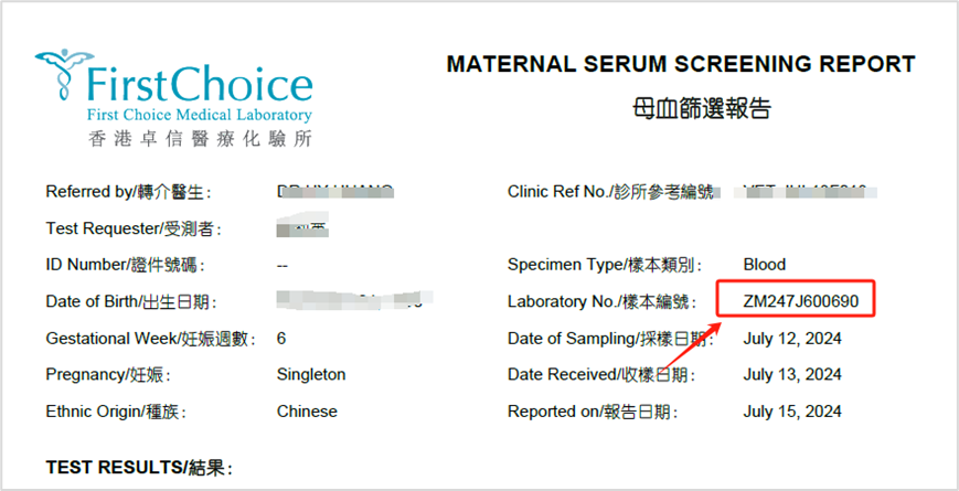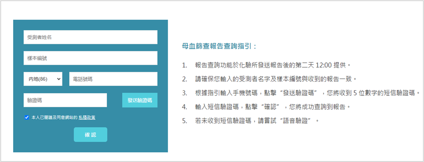 3、填写(1)姓名(注意需要繁体)(2)样本编码(请查看您的报告)(3)电话号码:输入您自己的手机号码(4)验证码:先点击发送验证码,您的手机收到验证码后填写到对话框(5)输入完成后点击确认