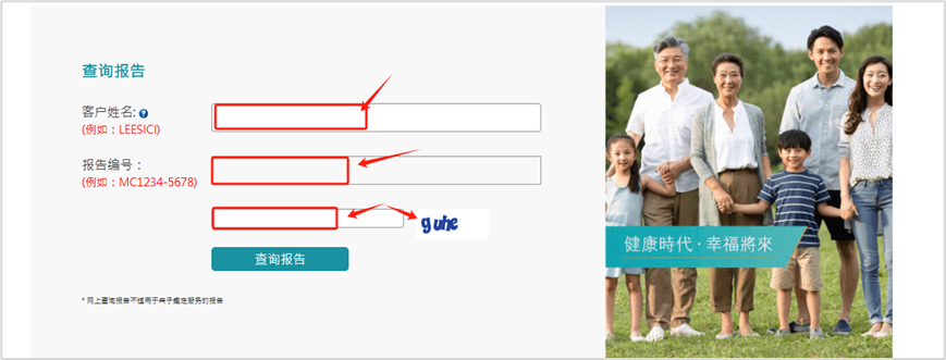 3、输入(1)姓名 注意:填写为全拼音、大写、无空格;(2)报告编码 注:查看您的检测报告(3)验证码:右侧是验证码